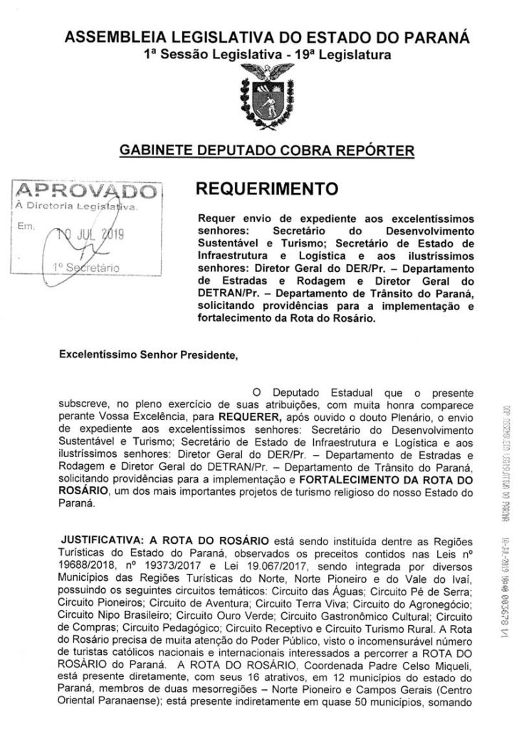 No documento, o deputado Cobra Repórter solicita aos órgão que sejam tomadas providências como a criação, padronização e instalação de sinalização específica por vias ao longo de toda a Rota do Rosário; a elaboração de modelos de contratos que visam formalizar parcerias com entes privados ou públicos; a criação, edição, organização e distribuição de material para promoção e divulgação da Rota do Rosário e seus atrativos; a intermediação para aproximação da Rota do Rosário com outras instituições e empresas, privadas ou públicas, de interesse para o turismo e seu desenvolvimento do Paraná, do Brasil e do Mundo e a inserção da Rota no circuito regional, estadual e nacional de eventos relacionados ao turismo e o lançamento oficialmente com divulgação do evento, após a aprovação do projeto de lei 434/2019, apresentado pelo deputado Cobra Repórter no início de junho que visa a inclusão da Rotado Rosário na rota das Regiões Turísticas do Paraná.